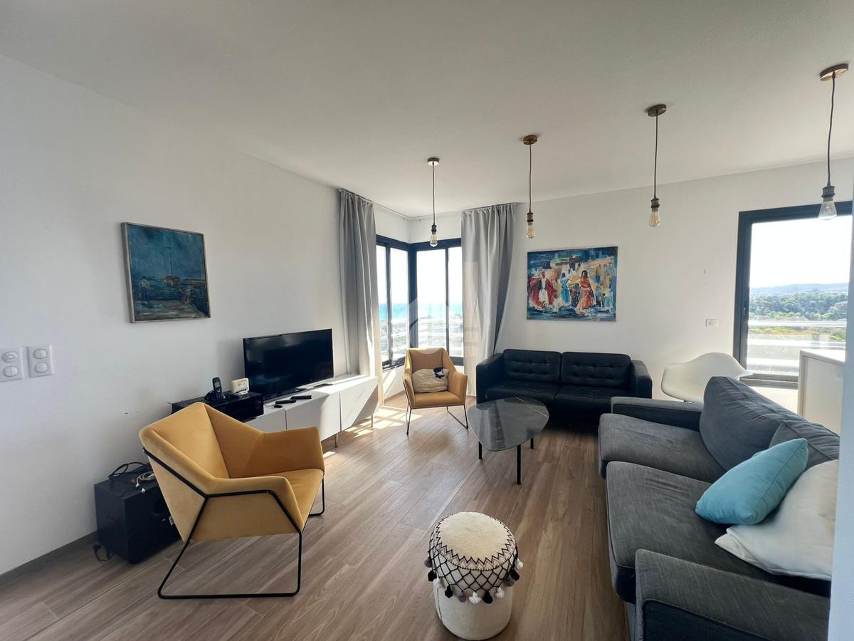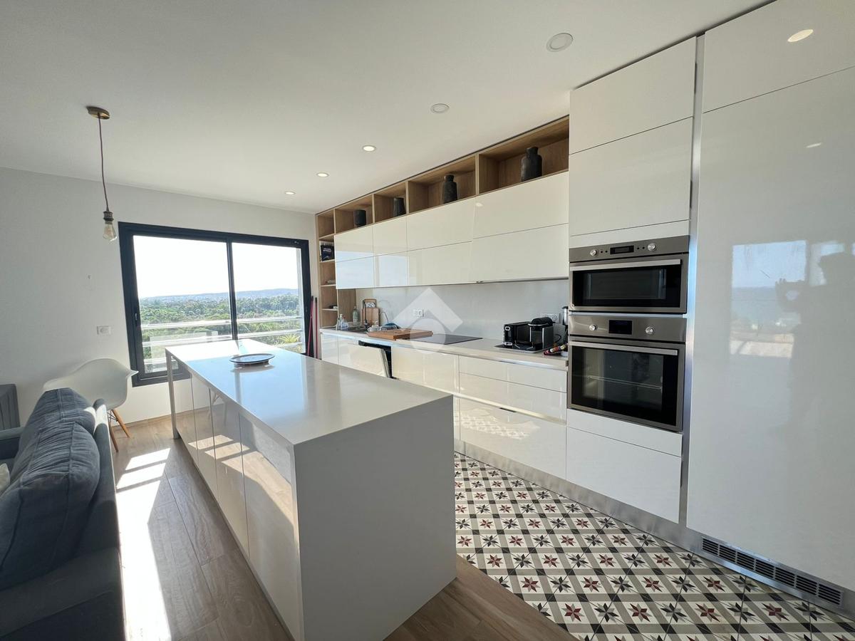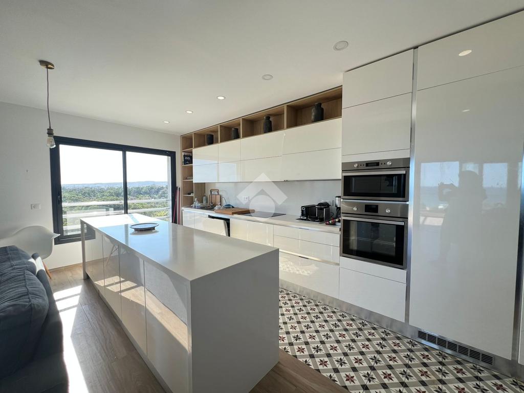 Dès l’entrée, un vaste espace de vie lumineux vous accueille, baigné de lumière naturelle grâce à ses larges baies vitrées qui s’ouvrent sur une terrasse offrant une vue dégagée sur la mer – un cadre idéal pour la détente.